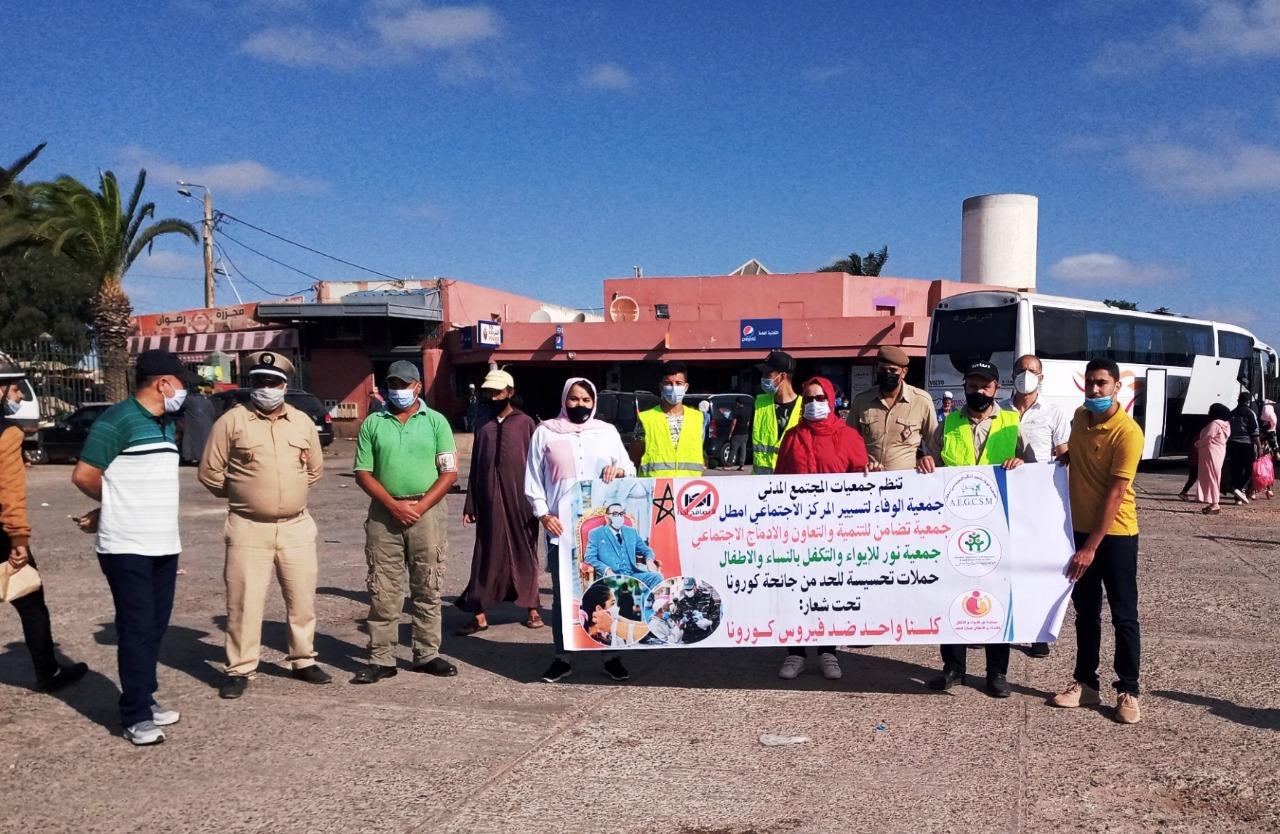 نظمت فعاليات المجتمع المدني بسيدي بنور خلال هذا الأسبوع من شهر يوليوز الجاري حملات متفرقة للتحسيس بخطورة الوضع الصحي بعد ارتفاع حصيلة عدد الإصابات والوفيات بوباء السلالة المتحورة لكورونا خلال الآونة الأخيرة، مع تسجيل تراخي العديد من المواطنات والمواطنين، فكانت فكرة تنظيم حملات تحسيسية بعدد من الجماعات الترابية بالإقليم لإثارة الانتباه وإعادة التذكير بالتقيد بالإجراءات الاحترازية، حيث تم التنسيق بين جمعيتي الوفاء لتسيير المركز الاجتماعي امطل، وجمعية التضامن للتنمية والتعاون والإدماج الاجتماعي، وجمعية نور للإيواء والتكفل بالنساء؛ تحت شعار "كــلنا واحد ضــد فيــروس كورونــا"، بتعاون مع السلطات المحلية والإقليمية...