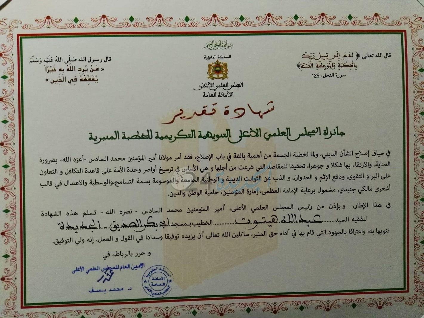 في اطار العناية التي توليها امارة المؤمنين لخطباء الجمعة، وإسهاما في تطوير رسالة المنبر وبإذن من رئيس المجلس العلمي الأعلى، أمير المؤمنين الملك محمد السادس، تسلّم الاستاذ الفقيه عبد الله هيتوت، الخطيب بمسجد أبي بكر الصديق بالجديدة، وعضو المجلس الأكاديمي للرابطة المحمدية للعلماء، شهادة جائزة المجلس العلمي الأعلى التنويهية التكريمية للخطبة المنبرية برسم السنة 1437 هـ/2016.