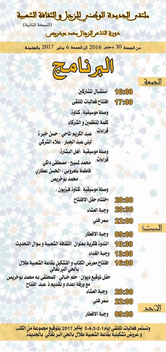 بعد نجاح الدورة الأولى من ملتقى الجديدة الوطني للزجل و سيرا على النهج، قرر الاتحاد المغربي للزجل فرع اقليم الجديدة، تنظيم الدورة الثانية من ملتقى الجديدة الوطني للزجل و الثقافة الشعبية "دورة الشاعر الزجال محمد بوخريص" و الذي ستمتد فعالياته أسبوعا كاملا، ابتداء من 30 دجنبر2016 إلى غاية 6 يناير 2017.
