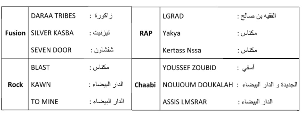 مجموعة الغيوان مازاغان و مجموعة ولاد الحلوي، بالإضافة إلى مجموعة شباب من مواهب
