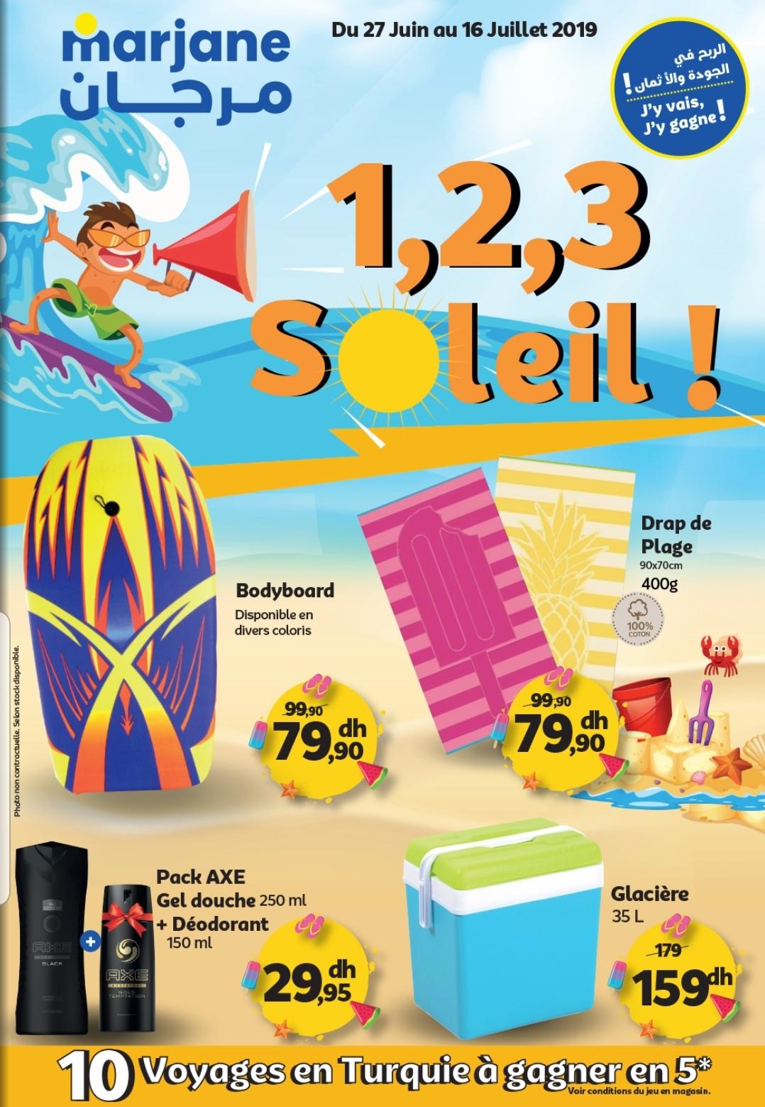 أطلق المركز التجاري مرجان، لزبنائه الكرام، ابتداء من يوم الخميس 27 يونيو 2019، عروضا مغرية بمناسبة فصل الصيف تحمل عنوان " 1,2,3 Soleil" حيث يوّفر خلاله تخفيضات مهمة تشمل مجموعة من المنتجات ذات العلاقة بالصيف والبحر والسباحة للاطفال وللكبار، وتستمر العروض الى غاية 16 يوليوز 2019 مع امكانية المشاركة في قرعة للفوز برحلات الى الديار التركية.