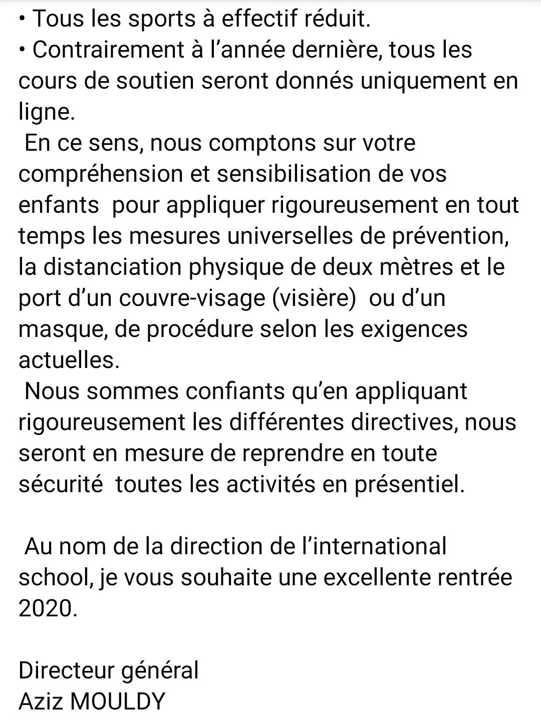 بعد ساعات قليلة من صدور بلاغ وزارة التربية والتعليم بخصوص الدخول المدرسي الجديد، سارعت مؤسسة انترناشيونال سكول بالجديدة الى اصدار بلاغ عاجل الى آباء و اولياء تلاميذتها لتخبرهم بأن المؤسسة قد أنهت كل الترتيبات الخاصة بالدخول المدرسي للعام الجديد في احترام كامل التدابير الوقائية طبقا للتعليمات الحكومية.