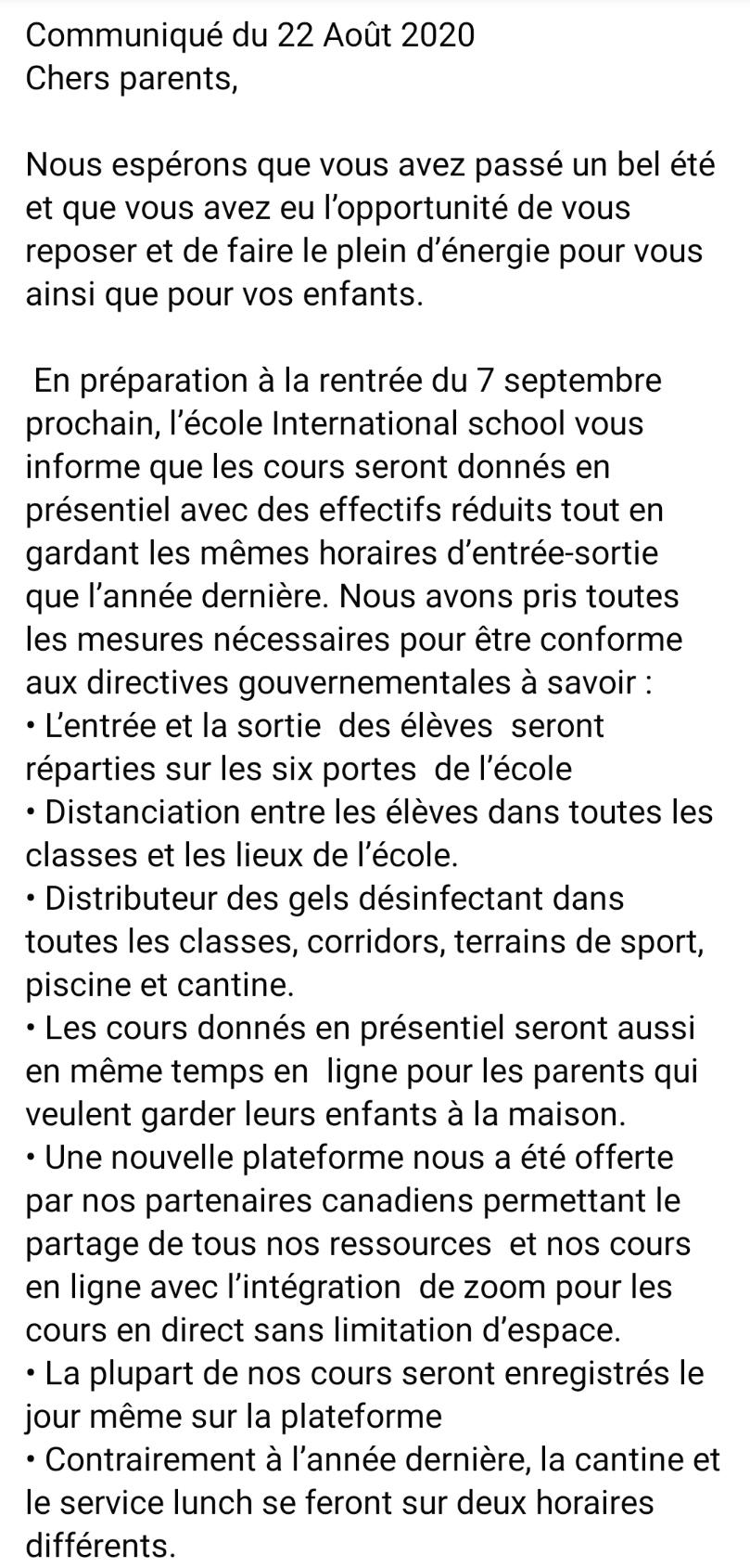 ومن أجل ضمان التباعد الاجتماعي بين التلاميذ أثناء الولوج والخروج من المؤسسة تعلن انترناشيونال سكول انها وفرت 6 أبواب بالمؤسسة وكل ذلك من أجل تجنب اي عدوى محتملة لا قدر الله داخل المؤسسة وفيما يلي البلاغ الصادر عن المؤسسة.