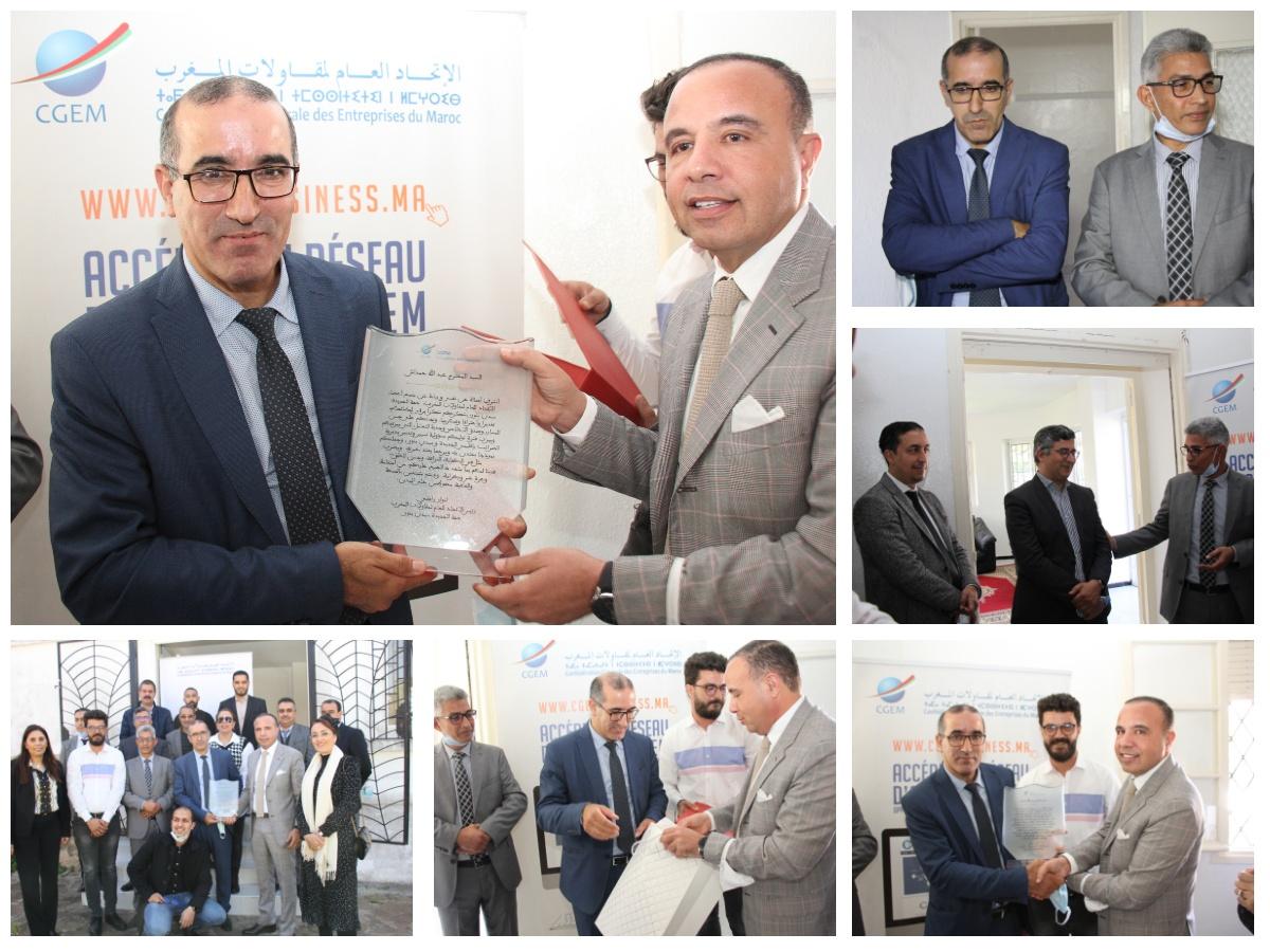 وقد تم تقديم درع الاتحاد وهدية تذكارية للمحتفى به، حيث تقدم بالمناسبة رشيد قاسمي نائب رئيس الاتحاد العام لمقاولات المغرب جهة الجديدة سيدي بنور بقراءة ما كتب في الدرع.