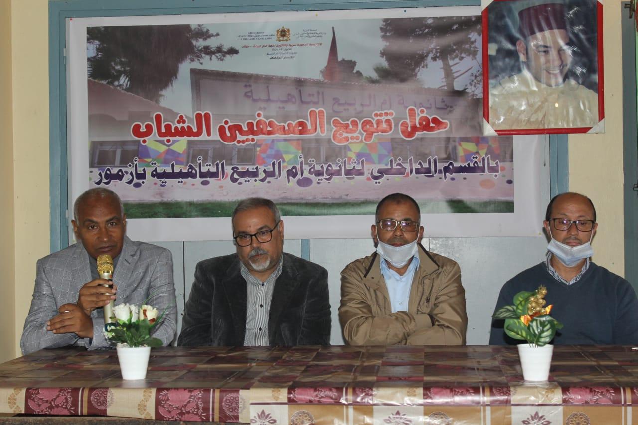 كشف القسم الداخلي التابع لثانوية أم الربيع التأهيلية بآزمور عن المتوجين في النسخة الأولى من مسابقة الصحفيين الشباب-جنس الخبر -، وذلك في أمسية رمضانية حضرها رئيس المؤسسة الأستاذ بوشعيب اعنبر وفعاليات وازنة لها ارتباط بالإعلام والرياضة بإقليم الجديدة، ويتعلق الأمر بالزميل أحمد امشكح الصحافي بيومية المساء ،الزميل بوشعيب بنقرايو رئيس جمعية الصحافة بالجديدة،الإطار التقني نور الدين لغماتي، الحكم السابق والمندوب الجامعي نور الدين حلمي والزميلين عبد الإله كبريتي وشعيب مرزاق اللذين يديران موقعين الكترونيين بحاضرة آزمور.