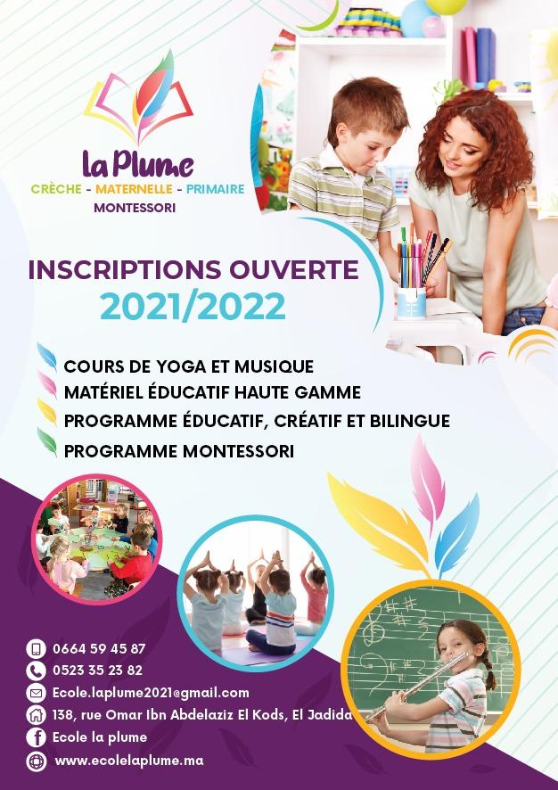 هذا وتعلن ومؤسسة La Plume أن أبواب المؤسسة مفتوحة لساكنة الجديدة من آباء وأولياء التلاميذ الذين يرغبون في الاطلاع على مرافق والبرامج التربوية وذلك طيلة أيام الأسبوع باستثناء يوم الأحد..